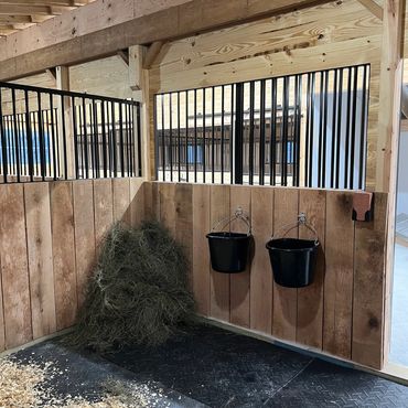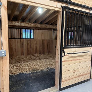Legacy Stables barn offer six spacious 12 x 12 stalls, a large indoor wash stall and a heated tackroom complete with a sink, saddle racks and sitting area. Our barn has been finished off with rough brushed cement floors for no slipping and garden fans for excellent airflow. Each stall is outfitted with plenty of wood shavings, high quality forage, fresh water from our brand new well and a salt block.